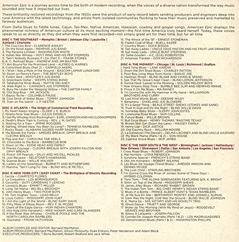 AMERICAN EPIC: The Collection gathers 100 of these original recordings from the 1920s and 1930s in one five-disc set, restored to unprecedented levels of sonic fidelity. For this box set, compiled by Director Bernard MacMahon, engineer Nicholas Bergh refined a transfer process using a mix of both modern and vintage equipment in order to extract the remarkable resolution from the records that is often missed. This reverse engineering approach to the transfer process enabled the restoration team of Grammy Award-winning engineer Peter Henderson, Duke Erikson and Joel Tefteller to get the resulting audio closer to the original performance than ever before. This is not "remastering," in the normal sense, but something closer to fine art restoration. The intent is not for people to marvel at the antiquity of these discs, but rather to experience them as vital, immediate performances that speak to us as directly as they did on the day they were recorded not simply great art for their time, but great art for all times. It includes a 100-page book filled with stunning unpublished photographs, quotes from the artists, their friends and families, lyrics for every song, essays and recording notes. Among the artists included are Mississippi John Hurt, The Carter Family, Charley Patton, Jimmie Rodgers, Lydia Mendoza, Nelstone's Hawaiians, Big Chief Henry's String Band, Robert Johnson and many others.