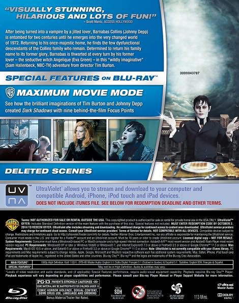 Transformed into a vampire and entombed for 200 years after betraying vengeful witch Angelique Bouchard Eva Green, 18th century fishing magnate Barnabas Collins Johnny Depp returns to Collinwood Manor in 1972, only to find his once proud estate in ruins and his family plagued by macabre secrets. It was the year 1752 when Barnabas' parents came to America to expand their business empire. But after establishing the thriving New England fishing town of Collinsport, the family experienced a series of misfortunes when Barnabas fell for the gorgeous Josette DuPres Bella Heathcoate and cast aside beautiful witch Angelique, who cursed him with eternal life and buried him deep in the earth. Returning home to Collinwood Manor after being dug up by a construction crew in 1972, Barnabas learns that Angelique has nearly driven his family out of business, and turned the townspeople against them. Determined matriarch Elizabeth Collins Stoddard Michelle Pfeiffer employs live-in psychiatrist Dr. Julia Hoffman Helena Bonham Carter and enchanting governess Victoria Winters Heathcoate to try and help young David Collins Gully McGrath get over the mysterious death of his beloved mother, but as Barnabas gets acquainted with his distant ancestors -- including Elizabeth's black-sheep brother Roger Jonny Lee Miller and headstrong teenage daughter Carolyn Stoddard Chloe Moretz -- their suffering weighs heavily on his shoulders. Later, when Angelique learns that Barnabas has returned on a mission to restore his family to its former glory and fallen for the radiant Victoria who is actually Josette reincarnate, she vows to make his suffering unimaginable if he should dare refuse her once again. Jackie Earle Haley, Bella Heathcote, and Gulliver McGrath co-star.