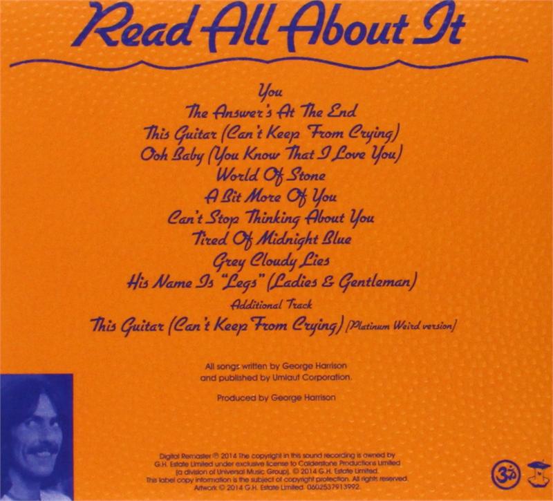 In late 1974, George returned to California to record his next album, the soul-tinged Extra Texture (Read All About It), his final album to be released through Apple Records. Leon Russell played piano on 'Tired Of Midnight Blue,' and for some of the sessions, Harrison was joined by guitarist Jesse Ed Davis, plus Jim Keltner, Paul Stallworth, and David Foster from new band Attitudes, who were later signed by George's newly formed Dark Horse label. Two of the LP's songs date from 1974 sessions for Dark Horse at George's home studio: the soulful love song 'Can't Stop Thinking About You' and the backing track of 'His Name Is 'Legs (Ladies & Gentlemen).' The new release adds 'This Guitar (Can't Keep From Crying),' a song Harrison rerecorded in 1992 as a demo for Dave Stewart, who plays electric guitar on it. More than ten years later, the track received overdubs by Ringo Starr on drums, Dhani Harrison on guitar, and vocalist Kara DioGuardi. The CD booklet includes newly written historical notes by Kevin Howlett.