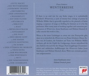 A superstar of opera, Jonas Kaufmann is somewhat less renowned for his interpretations of art songs, though this 2014 Sony release of Franz Schubert's "Winterreise" is his second disc in the genre, following his 2009 recording of "Die schöne Müllerin" for Decca. Even though it's more recognizable in the context of his Wagner and Verdi roles, Kaufmann's fluid and strongly supported tenor voice is well-suited to Schubert's arching lines and lyrical expressions, and its warm tone and rich timbres convey a variety of moods and emotions with minimal effort and no strain. Kaufmann and his longtime accompanist Helmut Deutsch have performed this song cycle in recital many times, and this performance reflects an ease and familiarity with the material and each other's timing that seem quite natural and spontaneous. Sony's recording does justice to the vocal part and the accompaniment by evenly balancing them in the mix, rather than recessing the piano to favor the singer.